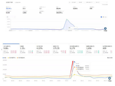 以下是一则预热期通过钻展去冲击收藏加购,最终达到店铺营业额在大促里狂翻20倍的例子,店铺日均钻展消耗在800元左右,在99大促前夕,把消耗提高到了10倍,大幅拉动了全店的收藏加购数据,到了活动当天,营业额瞬间爆发。