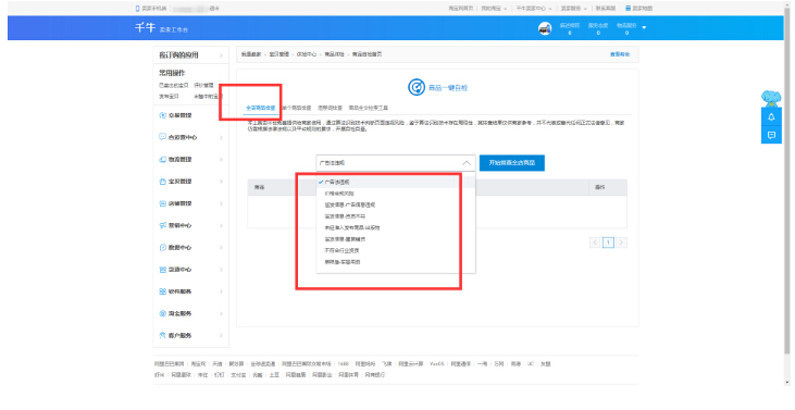 这里我们就可以看到我们第一个内容全店产品排查,包括广告法排查,价格是不是违规,是不是滥用信息等等,我们只需要选择我们要排查的违规类型,然后点击开始排查,通过这个方式,我们就可以对全店的产品进行排查,不合符规定的产品就会筛选出来。
