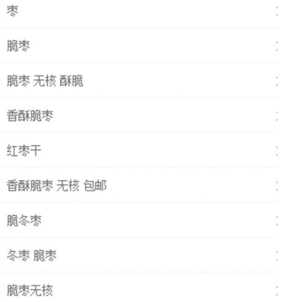 通过进店关键词可以找到对应本店产品突出的卖点!然后表格统计进店关键词,从进店关键词中找到,顾客在意的产品点,发现酥脆、冬枣、无核是消费者进店主要关键词!那么主图就显而易见需要添加,酥脆,冬枣,无核三个关键词!其他类目也相同,将进店关键词进行统计及分析,选取其中顾客比较在意的点,进行突出!