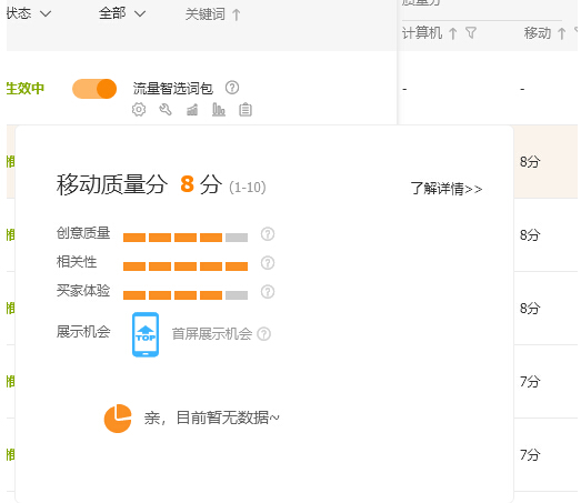 买家体验度主要是体现在买家通过直通车进入宝贝页面后产生的访客价值,比如是否有收藏,加购,转化等有价值的浏览行为,从而综合的一个评判因素影响。另外页面的访问数据,比如浏览时长等也是会有相关影响,所以我们可以通过分析宝贝的页面数据情况,针对单品来做一些营销活动,刺激买家能够有进步的行为,比如收藏加购,甚至直接成交转化。