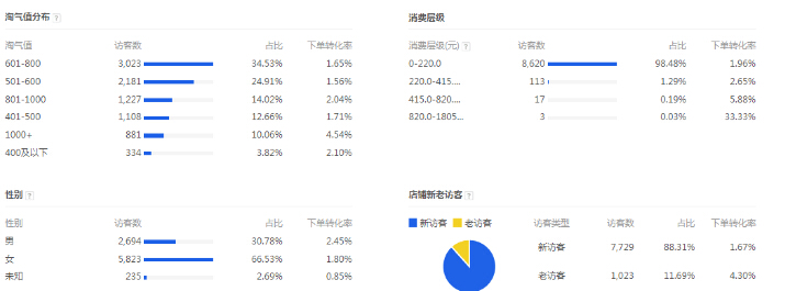 我们必须了解权重的主要构成因素,然后再根据这些因素逐个击破,权重的构成因素主要包括了:店铺层级、点击率、收藏加购、DSR 、动销率、访问深度、旺旺回复速度等等。