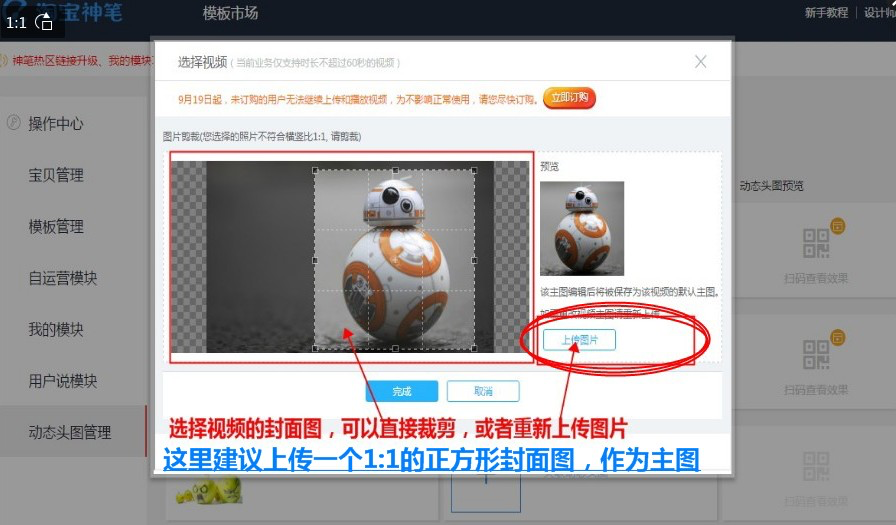 (5)这步很关键!选择好头图视频后,记得一定要做好头图视频封面,即你的主图第一张图,这个对你的视频点击转化有明显效果!不然你做的视频没人点击也无用,所以记得最好还是直接上传一个1:1的视频封面,可以在封面上加“满送”“限时优惠”“领券”“双11”等吸引用户点击的营销点。