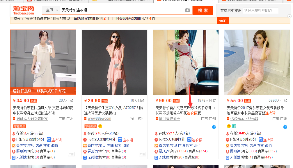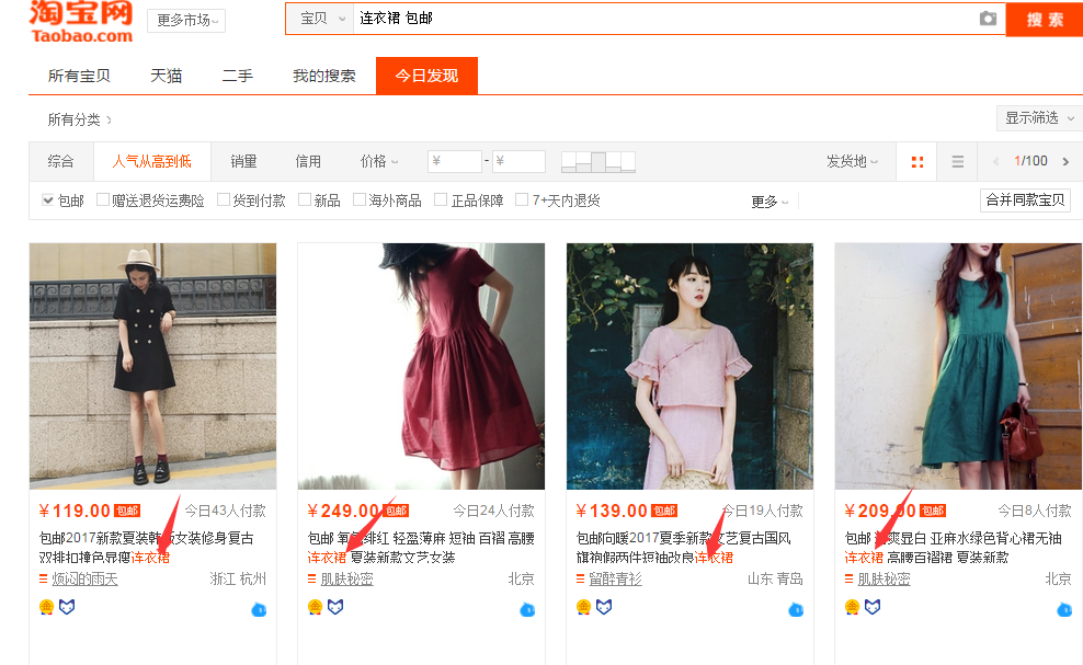 第二,大家发现没有,在我们搜索后宝贝标题,只描红了‘连衣裙’这个词根 ,而‘包邮’并没有被描红,这说明了什么?这说明‘包邮’是一个系统默认关键词。在买家搜索‘包邮’的时候,搜索引擎会直接默认展示包邮产品,在标题中有无‘包邮’,都是无所谓的,搜索引擎不会去甄别他。