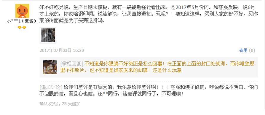 图上的卖家和顾客干起来了,因为生产日期的问题。一个说没有生产日期,一个说有生产日期,是你看错了地方,有生产日期的照片你故意不拍。看到这种情况,我只会说“呵呵”,然后走人。顾客态度恶劣不假,但卖家不但没有平息怒火,反而被顾客给激怒了。一旦激怒,就不会冷静的思考问题,更不会合理的对待问题。对于这种不成熟的卖家来说,前来观看回评解释的潜在顾客,绝对是不会下单的,源于没有保障,在他家购物严重缺乏安全感。