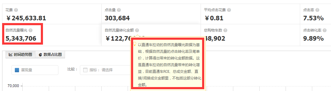 这张图大家可以看到,我一个月花费了24.5万,光带动的自然曝光量就有500多万,以及带动12.2万的自然转化金额,还并不算直通车的成交金额。