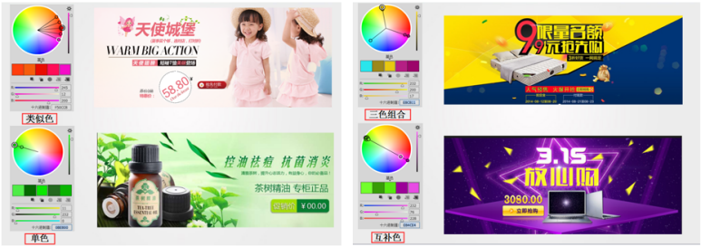 如图所示:每一个色轮所配合的图片均是通过色轮的色彩整体搭配出来的效果,这样大家就不用发愁如何配色了。这个地方不懂的是可以随时过来咨询我