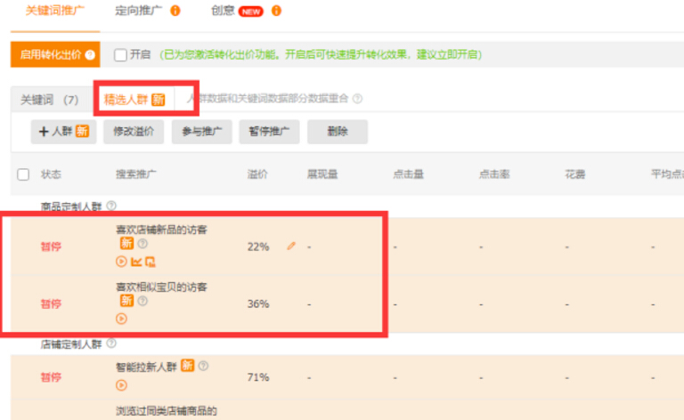 既然能够新增这些栏目,就代表着栏目的需求性也展现也都是会有一定的机会。所以每一次的直通车改版,我们都要快速的去熟知,然后去玩透,如果店铺不适合做,就尝试后放弃。但是连尝试都不敢的话,我相信想要发展都不会是一件容易的事情。在于直通车精选人群这块,溢价是最容易得到人群标签的定位了。再者就是尝试定向,定向的话主要还是圈定人群原本的习惯,所以只要点击率能够维持的话,人群标签形成也是有一定的作用。
