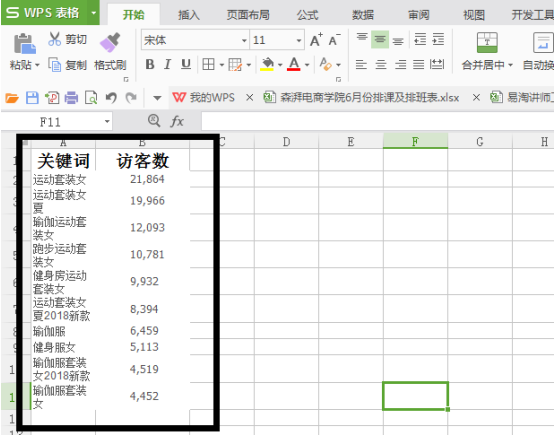 那么这个时候我们就要开始统计数据了,首先咱们把“无线端的引流关键词”这些数据复制下来!然后新建一个Excel表格,咱们把这些数据复制进表格里面,那么前面这一列是属于“关键词”(写上),后面这一列是属于“访客数”(写上)!