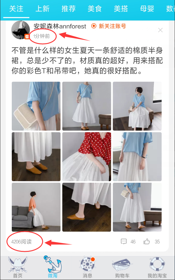 我们来看下这样的一个店铺,302万的粉丝,刚刚发布了一条新品搭配的微淘信息,仅仅只用了1分钟的时间,就有4206的阅读量,而这还只是一条普通的微淘,并没有特别去推广,如果是这样的一个店铺,想要上新品,想要有老顾客来破零,只需要针对老顾客做一场优惠活动,一百个销量,根本就不难。所以说,做到中后期,已经有一定老顾客资源的店铺,微淘这个点,一定要掌握好,并且去操作。而作为前中期的新店铺,也不要气馁,我们在初期粉丝不多的情况下,少量的粉丝也是粉丝,只要维护好了,一样能够增加客户粘性,让粉丝成为我长期的老顾客。