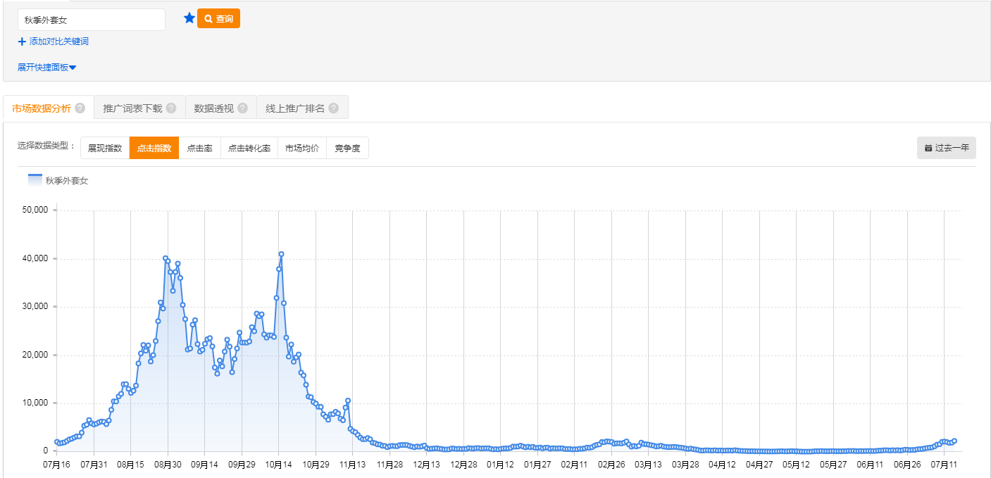 在时间节点的布局上我们要充分的观察市场流量的变化,以目前的的秋款布局来看,我们只能参照往年的秋款上升节点作为参考,然后再来对比分析近期的流量的波动请款,来确定行业的上升节奏,基本上每年秋款的流量提升节点都是很类似的,同时根据天气会有一些变化。同时进入秋季的市场需求地域差别也比较大。